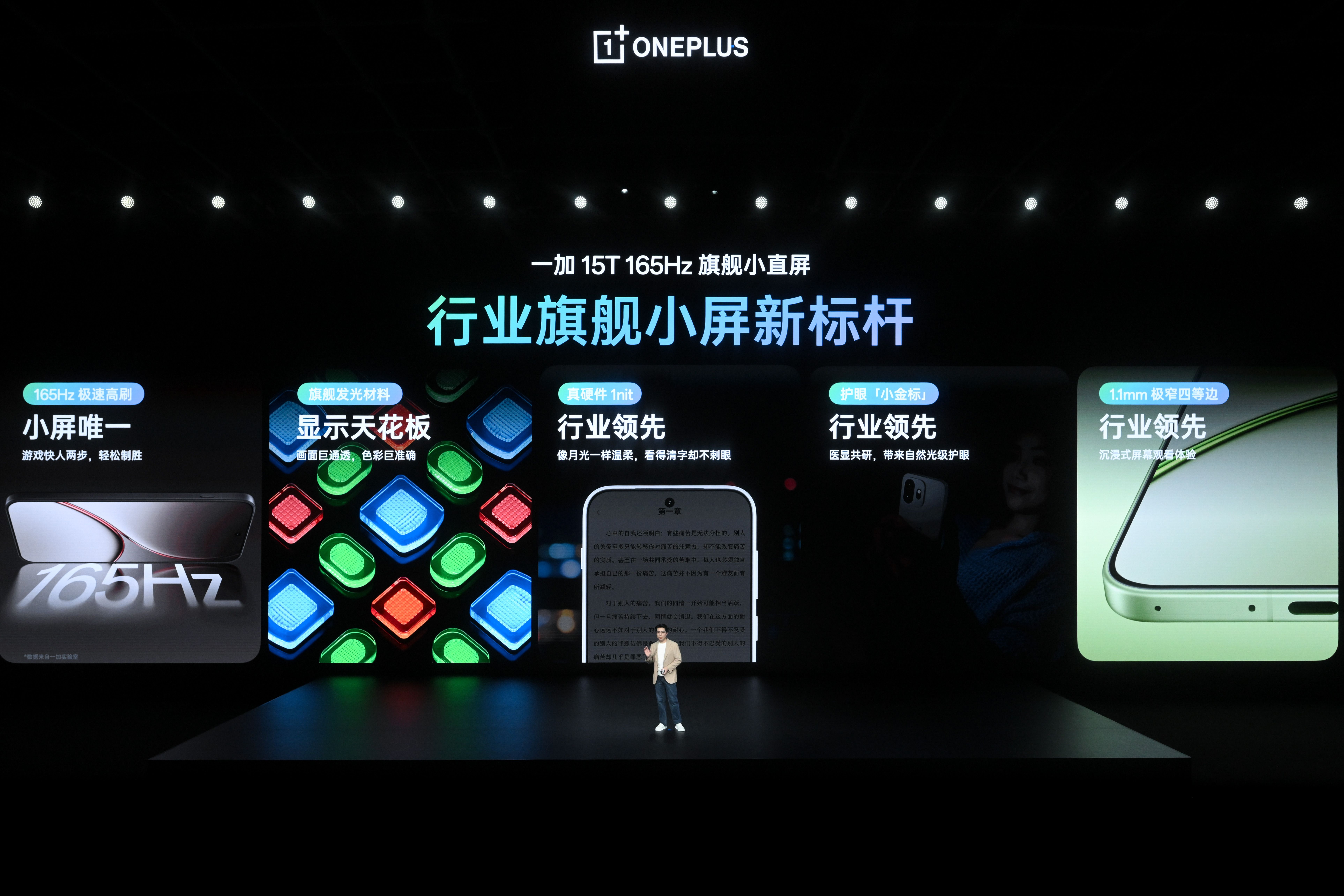 一加 15T 搭载行业唯一的 6.32 英寸 165Hz 旗舰小直屏,首次将超流畅的 165Hz 超高刷体验带给小屏旗舰。该屏幕采用全新旗舰发光材料,在色准、通透度、亮度均一性以及色偏控制上均做到行业领先。同时,一加 15T 还启用全球唯二、中国手机厂商第一条自研「屏幕科学产线」,每一块一加 15T 屏幕出厂前都会经过二次校准,全方位精准把控屏幕素质,为用户带来通透、自然、准确的色彩表现。此外,一加 15T 还突破低亮度下电流不稳定、显示色彩失准的行业难题,带来全场景「真硬件 1nit 暗夜显示」,即使是深夜微光环境,均能确保屏幕画面通透自然、舒适不刺眼。