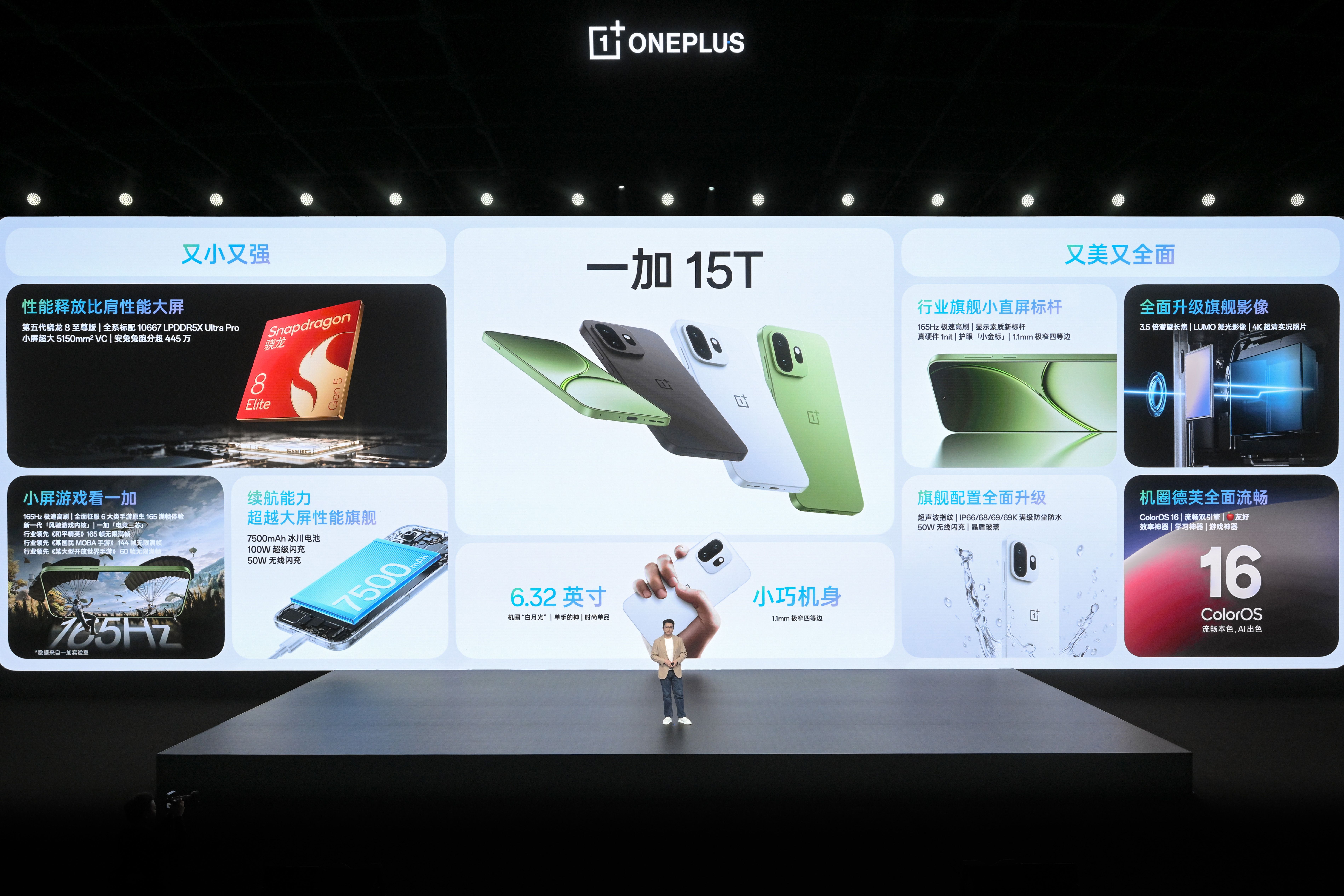2026 年 3 月 24 日,一加全新小屏旗舰一加 15T 正式发布。作为一加数字旗舰系列的最新力作,一加 15T 在 6.32 英寸的精巧机身下,实现性能、游戏、续航、影像及系统等维度的全面跃升。一加 15T 搭载第五代骁龙 8 至尊版移动平台、自研电竞网络芯片 G2 以及灵犀触控芯片,配合独家自研新一代「风驰游戏内核」与冰河散热系统,实现行业唯一小屏手机 165 超高帧游戏体验。一加 15T 配备 7500mAh 超巨量冰川电池+100W 超级闪充+50W 无线闪充的豪华续航回血组合,随时随地快速补能。一加 15T 搭载 5000 万像素 3.5 倍潜望长焦镜头和 LUMO 凝光影像系统,拍人拍景都好看。一加 15T 还内置全新 ColorOS 16 系统,带来多项高效的 AI 功能与全新的游戏助手体验。此次一加 15T 带来「治愈白巧」、「松弛抹茶」和「纯粹可可」三款配色。