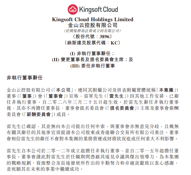 金山云近日在港交所发布重要人事变动公告,公司原非执行董事雷军因工作重心调整,已正式辞去相关职务,该决定自3月25日起生效。此次变动不仅涉及非执行董事职位,雷军同时卸任董事长、董事会提名委员会主席及薪酬委员会成员等核心职务,标志着其全面退出金山云管理层。