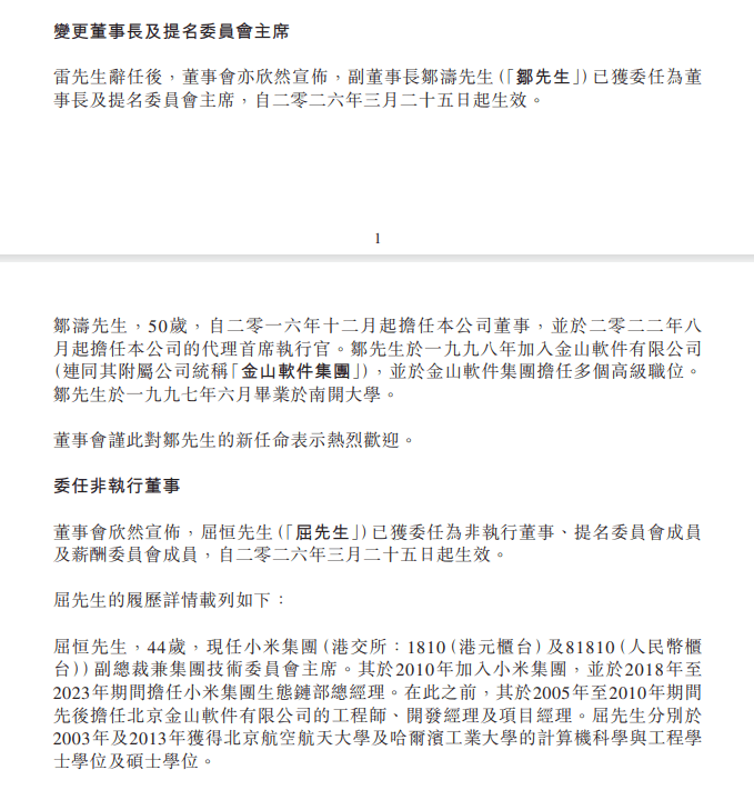 公告同步披露了新任管理层任命信息。原副董事长邹涛将接任董事长一职,并同时担任董事会提名委员会主席,全面主导公司战略决策与人事布局。另一项重要任命显示,屈恒获委任为非执行董事,并进入提名委员会与薪酬委员会,将参与公司治理架构优化与激励机制设计。此次人事调整覆盖董事会核心决策层,反映出公司治理结构的系统性升级。