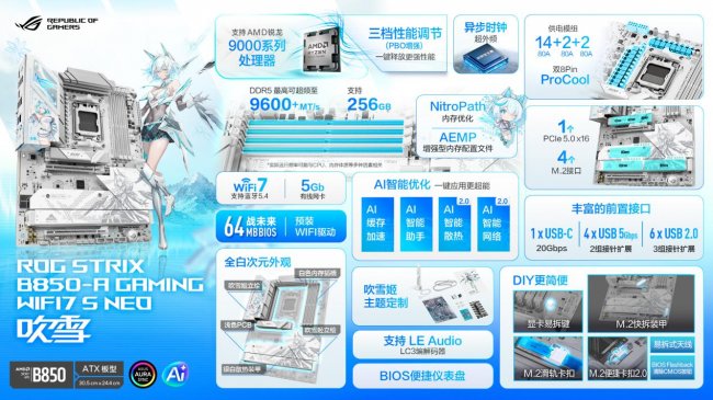 华硕ROG B850吹雪S NEO主板拥有14+2+2供电模组(80A),能充分释放锐龙9000系处理器潜力。更加入异步时钟,可实现CPU超外频,大幅提升超频灵活性。还有AI缓存加速,一键开启后可显著提升AI性能,全面优化Token推理速度与模型微调(fine-tuning)效能,赋能本地化AI应用高效运行。内存方面特别加入NitroPath内存优化,大幅缩短了stub残线的长度并提升了信号质量,搭配AEMP,内存频率至高可达DDR5-9600+(OC)。板载的4个M.2接口均配备高效散热片,可有效降低温度。除了主PCIe 5.0 M.2接口配备M.2快拆装甲外,M.2_3与M.2_4的散热片也支持快拆设计,搭配M.2便捷卡扣2.0及滑轨卡扣,可免工具装卸SSD。同时板载1个前置USB 20Gbps Type-C接口、4个前置USB 5Gbps接口以及6个前置USB 2.0接口,可同时外接多个设备。网络体验全面跃升,升级至5Gb有线网口,并支持WiFi7。搭配吹雪姬主题银白易拆天线,即插即用,好看更好用。配备64MB大容量BIOS,为“战未来”做好了准备。更预装WIFI驱动,实现开机即连,无需繁琐设置,网络体验一步到位。还有显卡易拆键,一键即可拆卸显卡,让硬件升级与维护变得前所未有的简单。音效部分则引入新一代LE Audio技术,降低延迟,让游戏沉浸感全面提升。