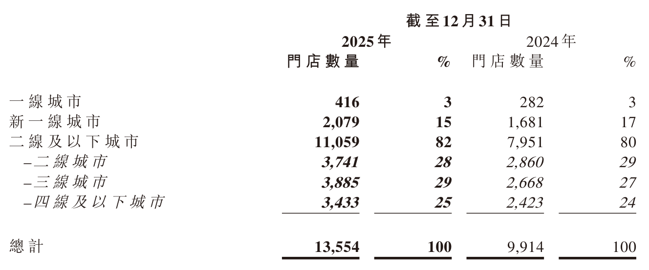 门店扩张是古茗控股2025年发展的核心战略之一。报告显示,截至2025年12月31日,公司门店总数突破13,554家,较2024年底的9,914家增长36.7%,覆盖全国超过200个各线级城市。从城市分布来看,二线及以下城市仍是主力市场,门店数量达11,059家,占总数的82%;新一线城市门店为2,079家,占比15%;一线城市门店仅416家,占比3%。这一布局策略体现了公司深耕下沉市场的战略定位。