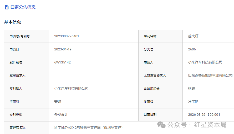另据知情人士补充,小米汽车在专利申请阶段采用了延迟审查策略,旨在防止核心设计在SU7车型发布前过早公开。该策略常见于新车研发领域,企业通过控制专利公开时间节点,确保产品市场竞争力。燕鲁新能源作为被告方,其提起专利无效申请属于专利侵权诉讼中的常规应对手段,此类程序通常用于质疑对方专利的有效性。