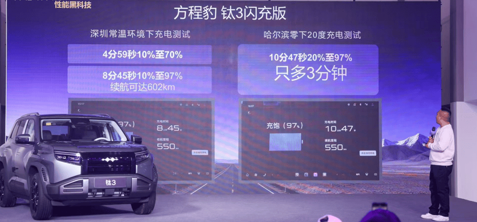 钛3闪充版的核心竞争力在于其闪充技术。比亚迪将集团顶尖的闪充技术首次应用于15万级主流市场,彻底改变了纯电行业“续航内卷”的现状。品鉴会上,媒体实测数据令人惊叹:常温下,车辆电量从36%充至97%仅需7分47秒,10% - 70%约5分钟,10% - 97%约9分钟。即便在零下30度的严寒环境中,补能时间也仅增加3分钟,真正实现了“5分好、9分饱、3分寒”,有效解决了纯电用户的补能焦虑问题。