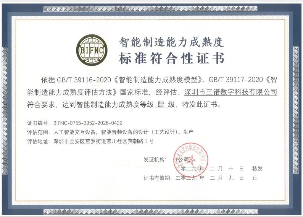 据介绍,三诺智慧声谷是按灯塔工厂标准打造、已全面投产的AI数字化灯塔工厂,荣获金砖国家未来网络研究院中国分院(BIFNC)颁发的智能制造能力成熟度四级(优化级)认证,摘下目前“智能制造能力成熟度”的最高级别。