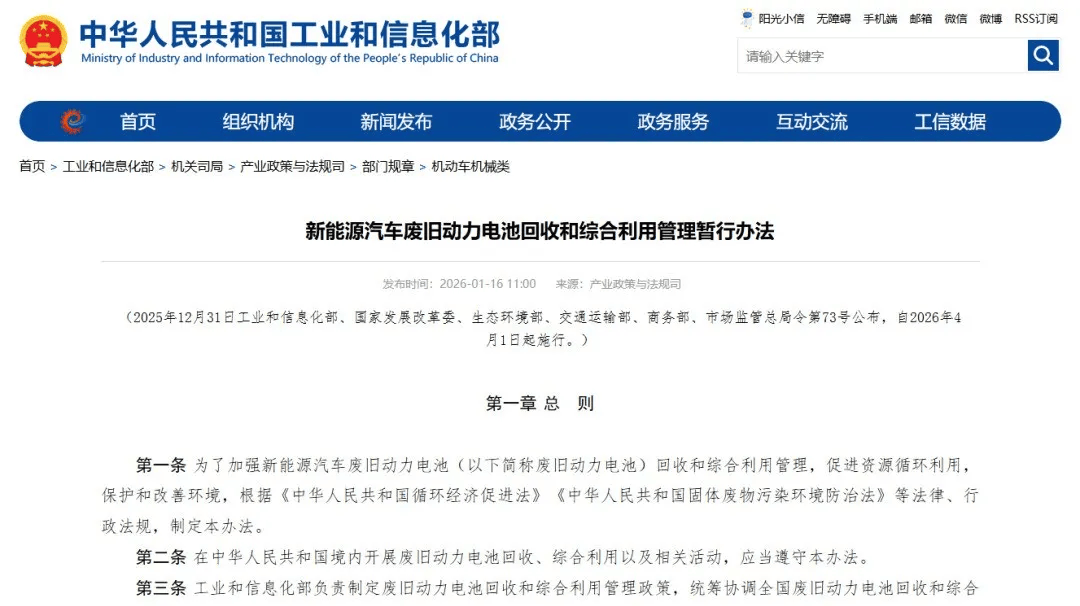 工业和信息化部联合其他五部门近日正式发布《新能源汽车废旧动力电池回收和综合利用管理暂行办法》,标志着我国新能源汽车动力电池回收利用进入规范化管理新阶段。该办法将于2026年4月1日起正式实施,通过构建全生命周期管理体系,为动力电池回收利用提供制度保障。