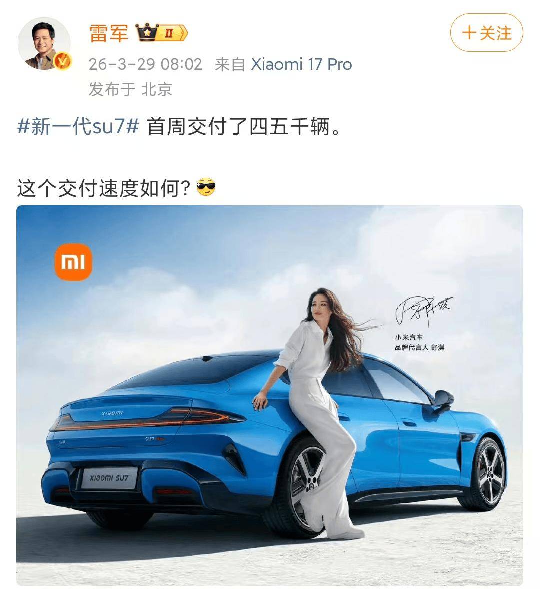 据小米集团董事长雷军透露,SU7上市首周交付量已接近五千辆,具体数字需待最后一日数据汇总后确认。面对网友关于交付量精确数值的询问,雷军回应称:"首周交付量包含今天最后一天的数据,能否突破五千辆今晚才能揭晓。"这种谨慎的表述方式,既体现了企业对数据准确性的重视,也反映出当前产能爬坡阶段的实际情况。