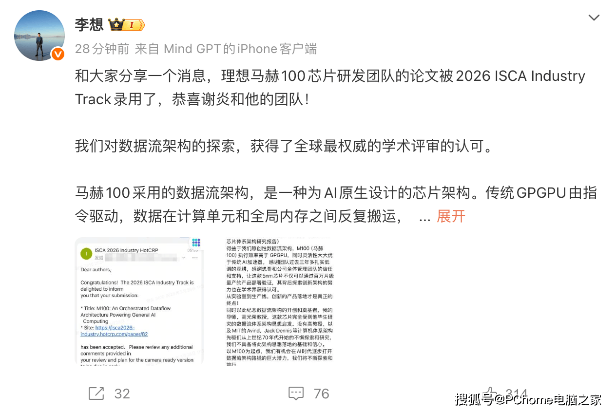 理想汽车在AI芯片领域取得重大突破,其自主研发的马赫100芯片相关技术论文,成功入选国际计算机体系结构研讨会(ISCA)2026年产业界轨道。这一成果标志着理想汽车在芯片底层架构创新方面获得国际学术界权威认可,为智能电动车技术竞争注入新动能。
