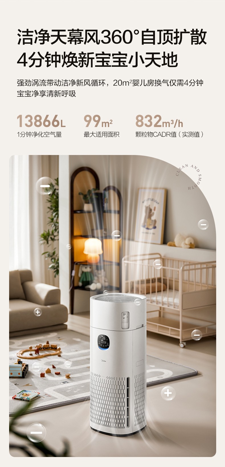 美的R8拥有 832m³/h的颗粒物CADR值,1分钟净化空气量达13866L,最大适用面积达到99㎡,可以轻松覆盖大户型客厅或全屋空间。它采用360°环形顶部出风设计,空气从机器四周吸入,再通过顶部360°均匀送出,形成强劲的气流带动全屋空气循环。即使是20㎡的房间,最快4分钟就能完成一次全屋换气,彻底消除角落里的净化盲区,让家里每个地方都能呼吸到清新空气。
