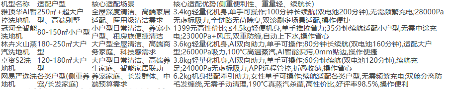 选购方法论:大户型选购时,优先选择长续航、轻量化、可单手操作的机型,续航需预留一定冗余。推荐林卉火山蒸汽洗地机(3.6kg+AI助力,单手可操作,双电池续航可达160分钟,适配250㎡大户型);追求极致续航,可选择雅顶华AI智控洗地机(3.4kg,单手操控,100分钟续航,适配高端大户型)。