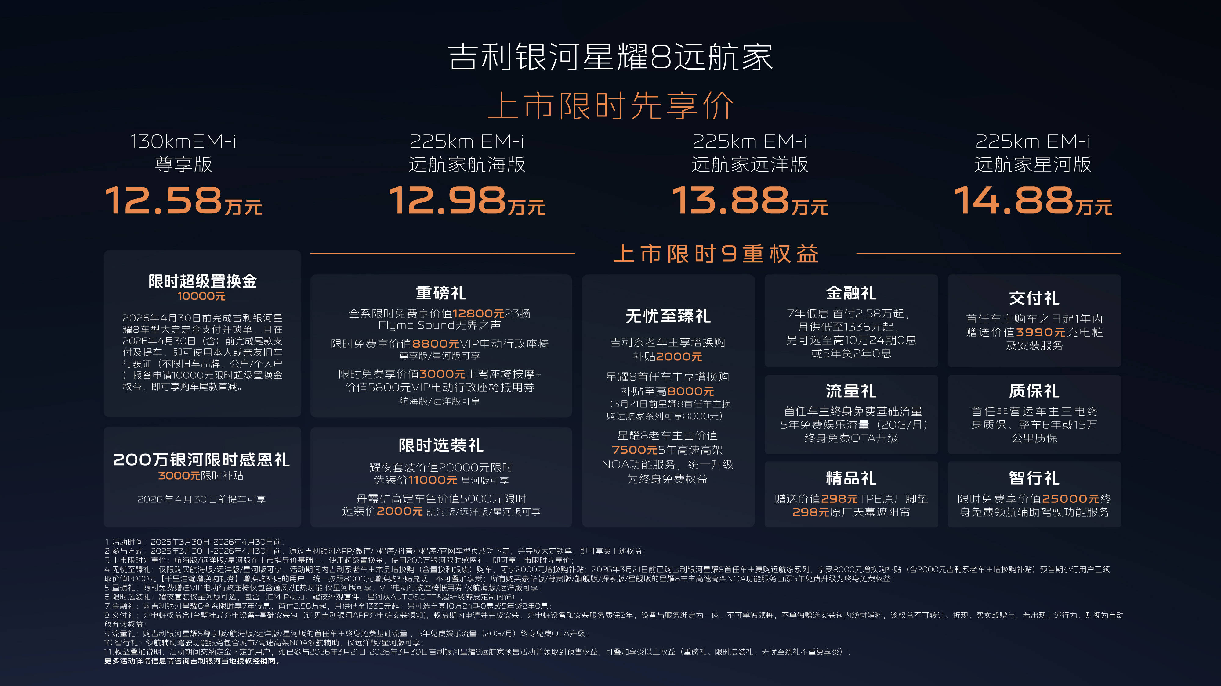 吉利银河星耀8远航家近日正式登陆市场,共推出三款不同配置车型,官方指导价区间设定为14.28万元至16.18万元。为回馈消费者,厂家同步推出限时优惠活动,先享价下探至12.98万元至14.88万元。值得注意的是,此前热销的130km EM-i尊享版车型仍保留销售,限时特惠价为12.58万元。