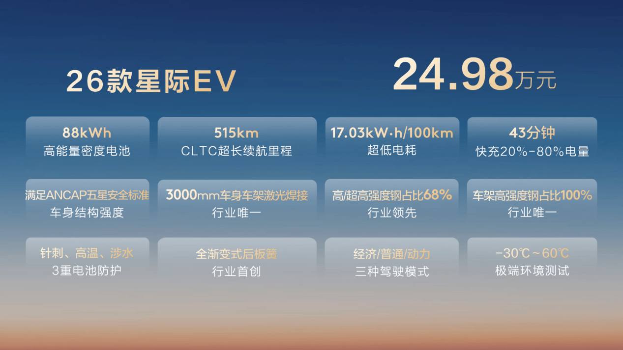 全新星际L以10.88万元的起售价惊艳亮相,其搭载的上汽πplus 2.5T柴油发动机,以165kW的最大功率和520N・m的峰值扭矩,成为同级性能标杆。更令人瞩目的是,这款柴油皮卡零百加速仅需9.6秒,一举打破柴油皮卡加速未破10秒的僵局。而26款星际EV则凭借自主开发的88kWh高能量密度电池,以超150Wh/kg的能量密度领跑同级,为电动皮卡市场树立了新的标杆。26款T60搭载的柴油发动机同样表现出色,120kW的功率和410Nm的扭矩,使其成为同级最强动力选择。