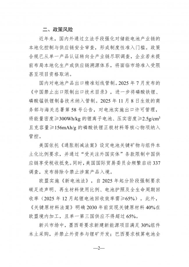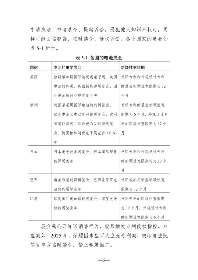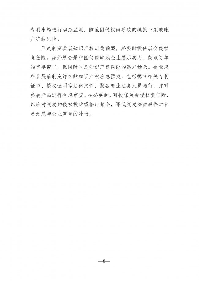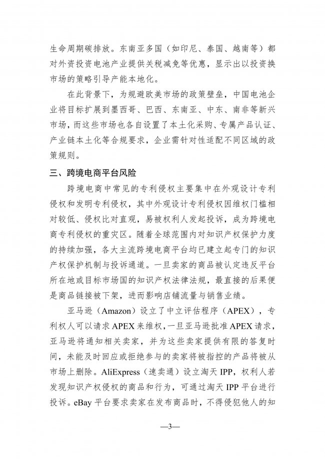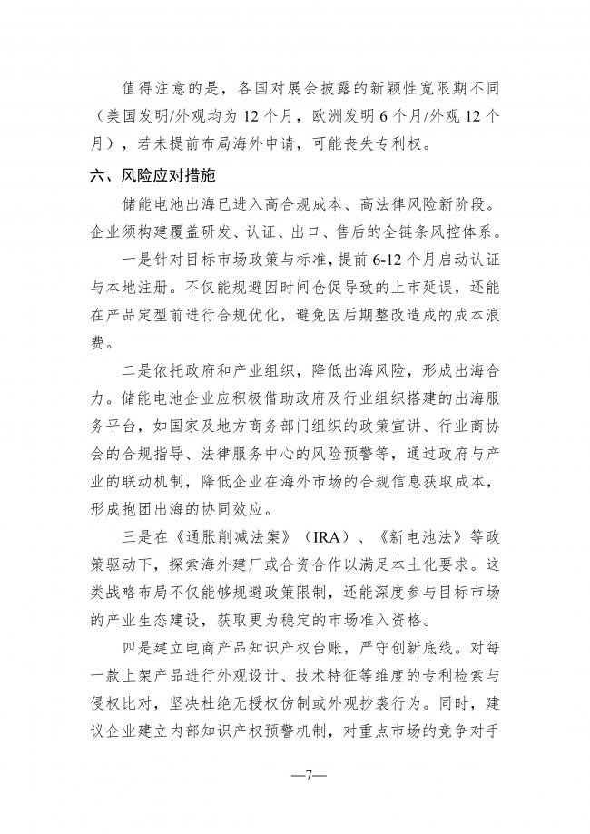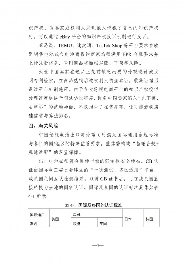 中国储能电池企业凭借完整产业链与成本优势,全球市场份额稳步提升,但海外拓展面临政策、知识产权、技术标准、海关监管等多重合规壁垒,尤其欧美市场的绿色壁垒、专利围剿等成为关键制约。报告聚焦政策、跨境电商平台、海关、展会四大核心风险:政策层面,国内外立法强化产业链本地化控制(如国内管制磷酸铁锂技术出口,欧美通过《通胀削减法案》《新电池法》设本土化比例、碳足迹等要求,新兴市场推本土化采购);跨境电商平台层面,外观设计专利侵权高发,亚马逊、速卖通等平台通过APEX、IPP等机制快速处理投诉,欧盟市场还要求EPR合规,中国卖家因缺乏专利检索易陷入“先下架后申诉”困境;海关层面,出口需满足“基础合规+属地适配”,需通过CB认证及目标国安全标准(如UL、CE认证),并提供UN38.3测试报告等文件;展会层面,各国对展会披露的专利新颖性宽限期规定不同,未提前布局海外申请可能丧失专利权。