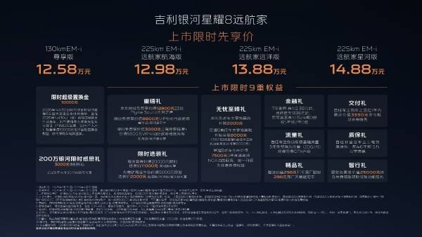 吉利银河星耀8远航家系列近日推出全新长续航版本,在原有130km EM-i尊享版基础上新增三款225km纯电续航车型,上市限时先享价区间为12.98万元至14.88万元。此次升级聚焦续航里程扩展与智能驾驶系统强化,同时通过演员黄宗泽以“阿sir的新车”为主题进行场景化营销,突出产品在颜值设计、科技配置与续航能力方面的综合优势。