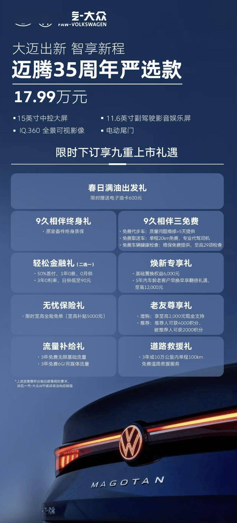 一汽-大众近日正式推出迈腾“35周年严选款”,官方指导价定为17.99万元。这款特别版车型在外观设计上融入了矩阵式大灯组,前格栅与灯带形成贯穿式视觉效果,搭配传统造型门把手与双腰线车身设计,车尾采用隐藏式排气布局并配备贯穿式LED尾灯,电动尾门成为全系标配。