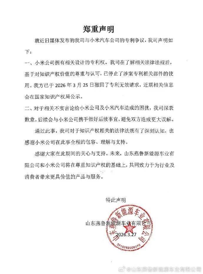 在最新声明中,燕鲁新能源明确承认小米汽车拥有相关设计的专利权,并表示已全面停止涉案专利部件的使用。该公司于2026年3月25日正式撤回专利无效请求,相关变更信息将于近期在国家知识产权局官网公示。对于此前媒体报道引发的不实言论,燕鲁新能源向小米汽车及其用户表达歉意,并承诺将加强内部知识产权管理,避免类似事件再次发生。