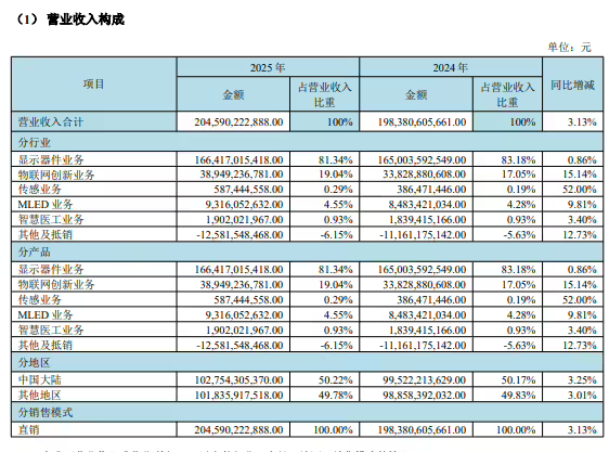 核心显示器件业务仍是营收主力,全年贡献1664.17亿元收入,同比增长0.86%。其中LCD面板在电视、显示器、笔记本电脑等五大主流应用领域及车载市场持续领跑全球,出货量稳居首位。柔性OLED面板业务则保持增长势头,在智能手机、可穿戴设备等高端市场持续扩大份额。值得关注的是,物联网创新业务成为新的增长极,该板块实现营收389.49亿元,同比增幅达15.14%,在智慧零售、智慧金融等场景的应用加速落地。
