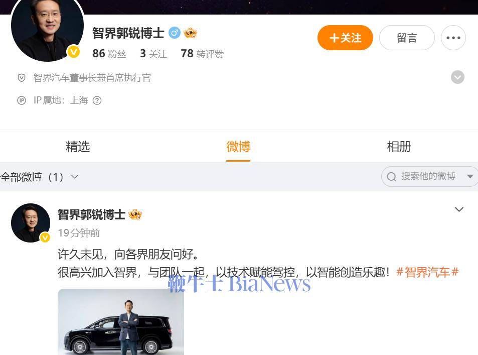2025年12月12日,郭锐通过公开渠道宣布辞去荣耀品牌营销总裁、管理团队成员及投资决策委员会委员等职务,并在声明中表示将开启"科技领域的新征程"。此次履新智界汽车,标志着其职业生涯正式转向智能电动汽车赛道。目前,郭锐的微博认证已更新为智界汽车董事长兼首席执行官,显示其已全面投入新岗位工作。