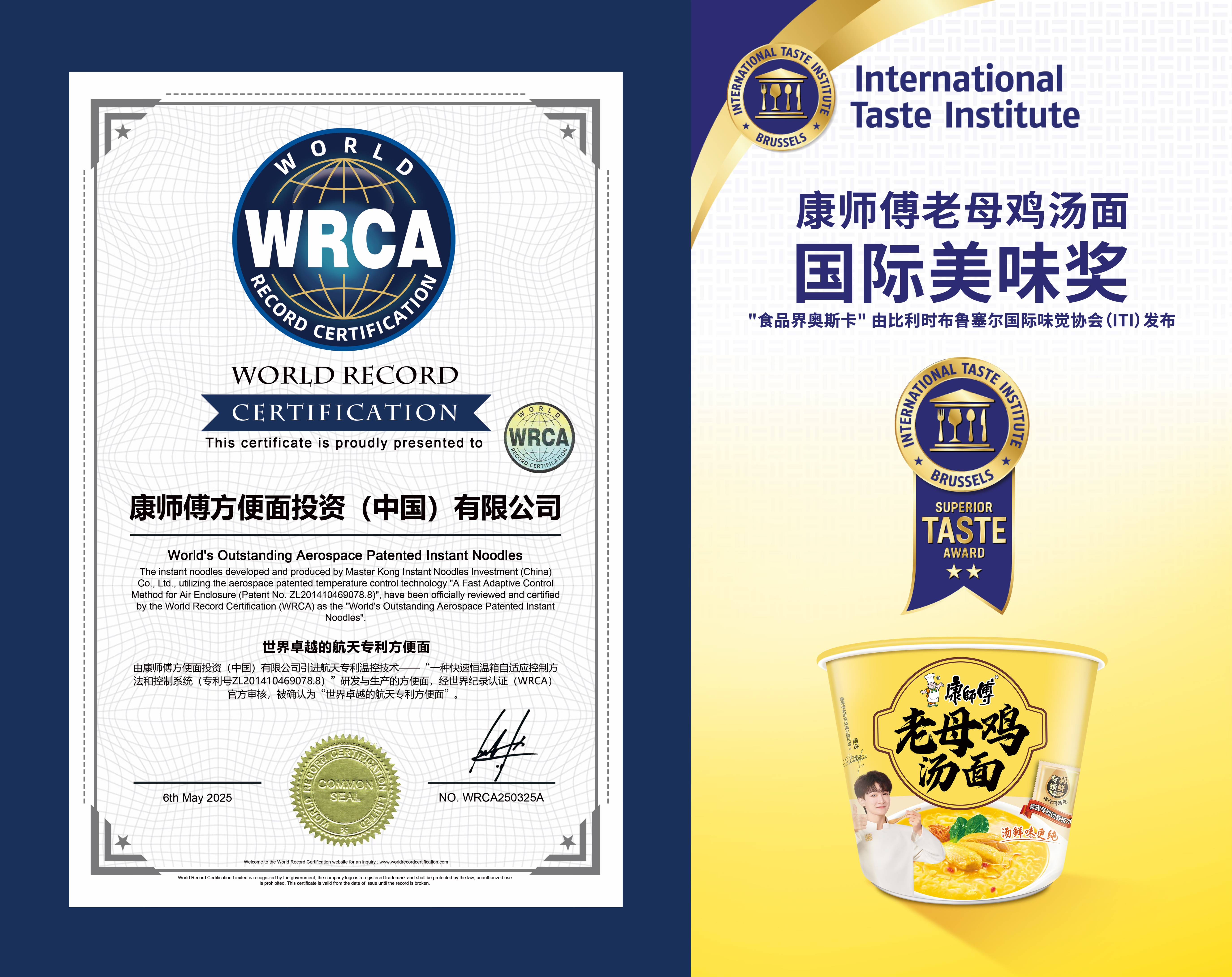 WRCA认证“世界卓越的航天专利方便面”\老母鸡汤面获得国际美味奖