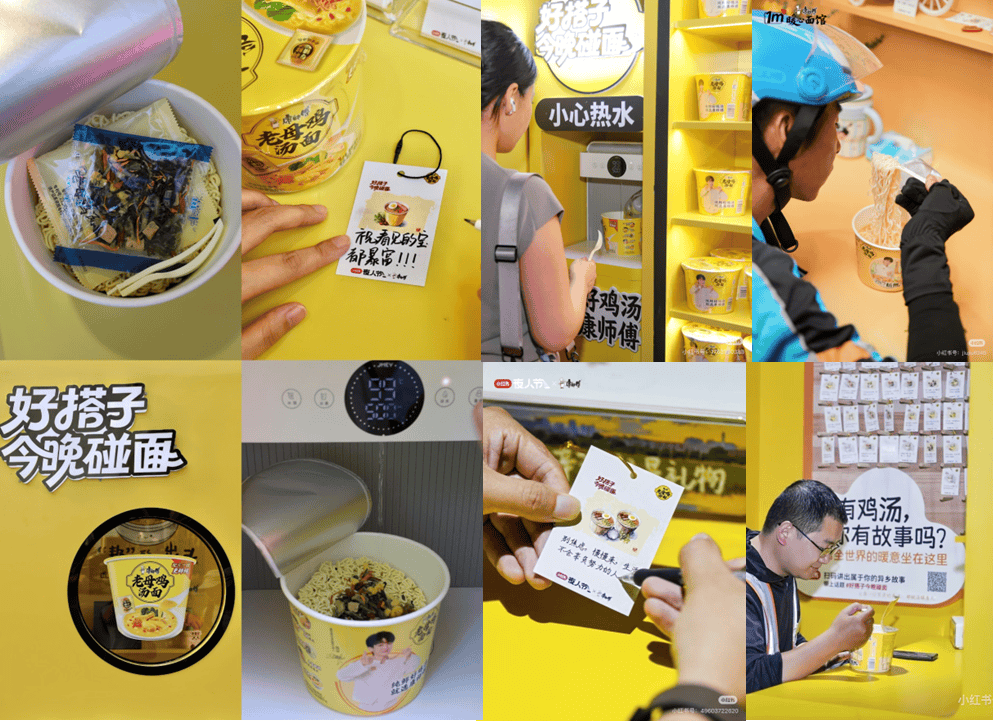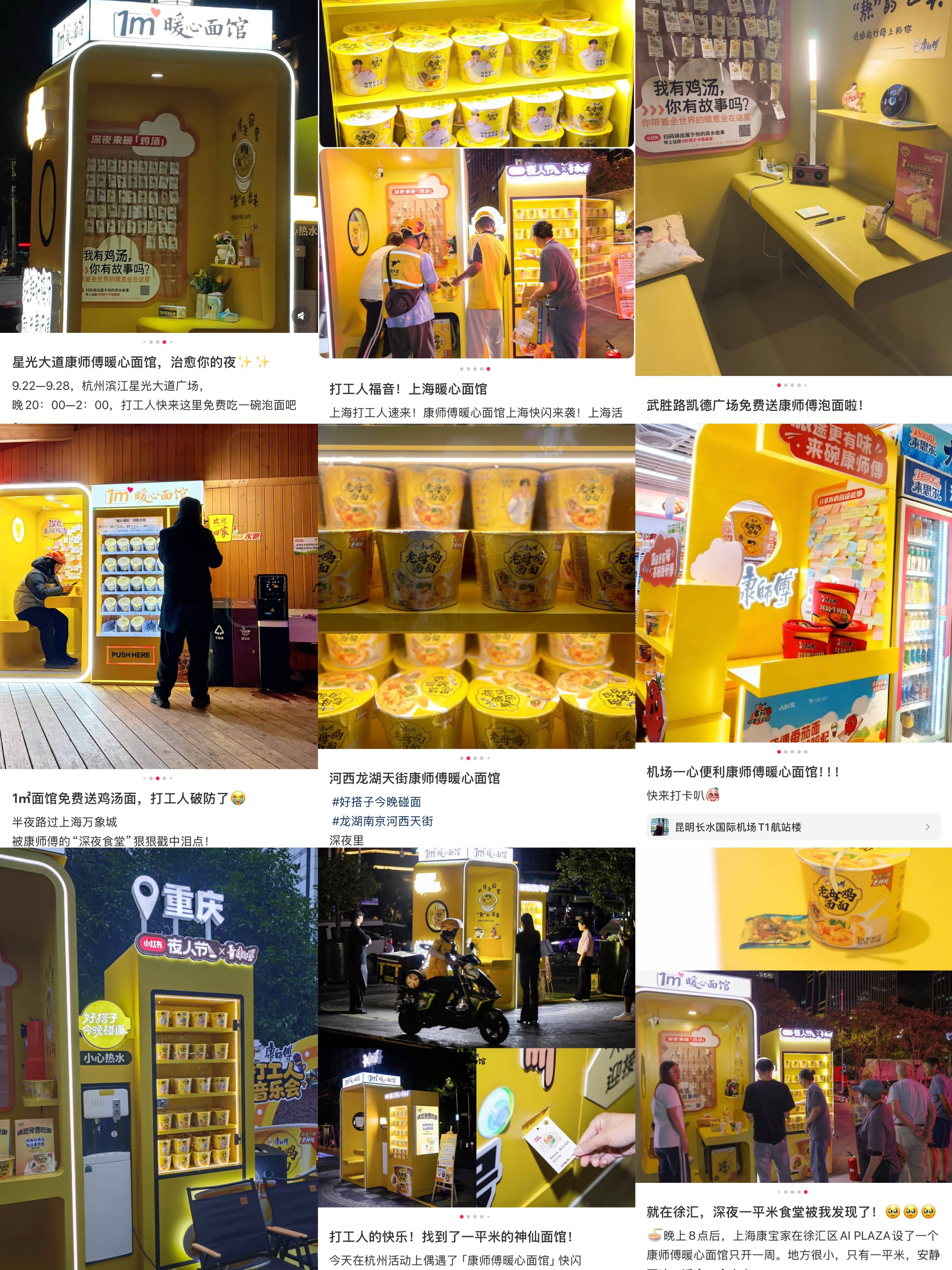 快消渠道的本质是连接人与货的节点,而康师傅的创新在于,将这个节点从冰冷的“交易点”升温为有情绪的“共鸣点”。“1㎡暖心面馆”便是这一理念最生动的注脚。2025年9月起,形似电话亭的快闪面馆陆续落地上海、杭州、深圳、安徽、四川、重庆、南京、甘宁、湖北等城市,以“1㎡私密空间+免费暖心泡面”为核心体验,每晚八点到凌晨两点,为奔波的骑手、晚归的白领等城市夜归人送上热腾腾的老母鸡汤面。这里不仅提供食物,更搭配治愈音乐和心事交换墙,迅速在社交媒体上发酵为一座座“情感地标”,“深夜治愈”与“城市温暖”成为深入人心的标签。