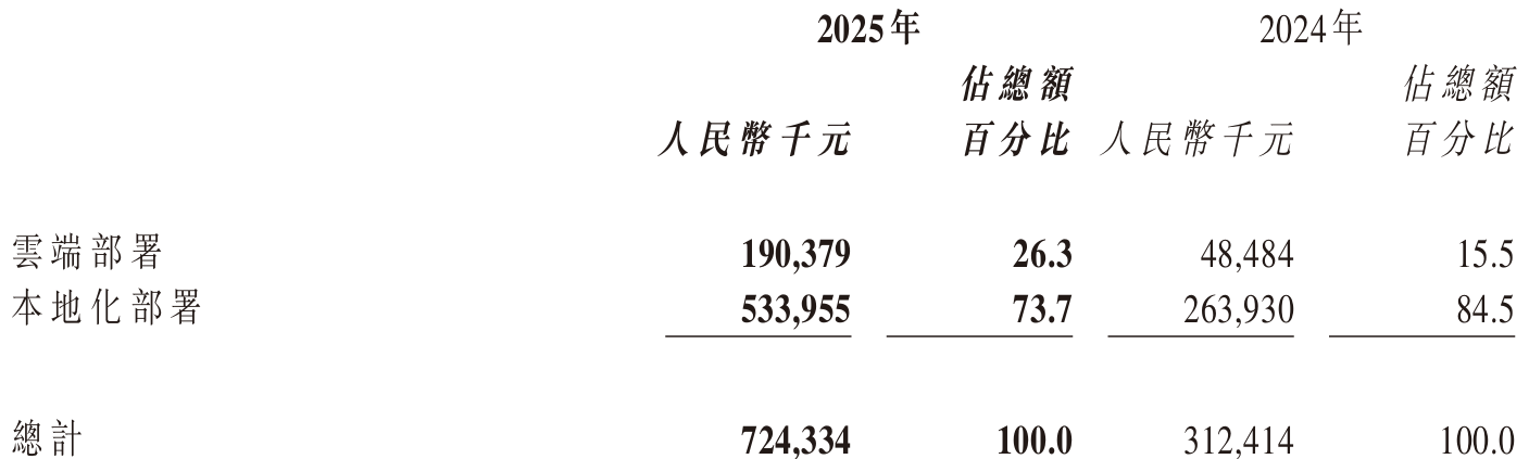 从业务结构来看,智谱的云端部署与本地化部署呈现出不同的发展态势。云端部署收入去年达到1.90亿元,同比增长293%,主要得益于模型调用量的显著增加;而本地化部署作为营收主力,去年贡献了5.34亿元,同比增长102%,但在整体营收中的占比有所下降,从2024年的近85%降至74%。这一变化反映出智谱业务结构的优化,但尚未迎来根本性转折。