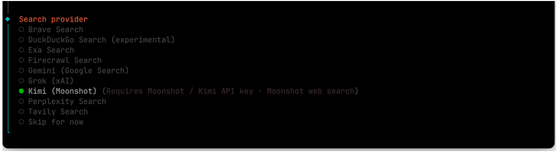 选择网络搜索提供商,选择 Kimi