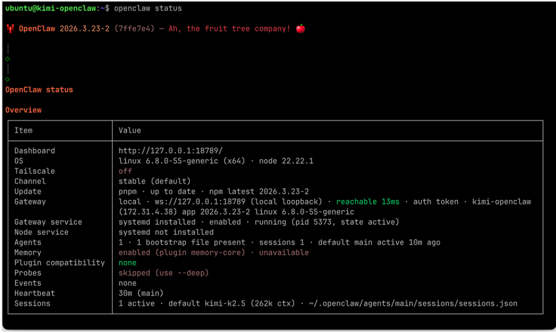 输入 openclaw status 可查看当前状态