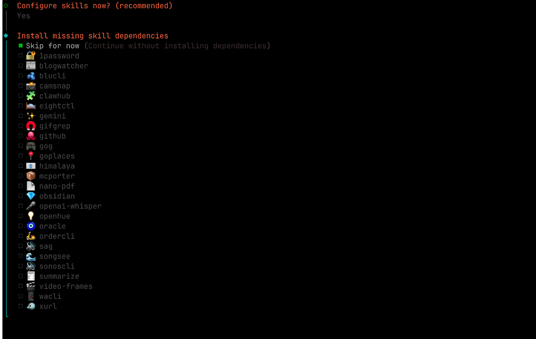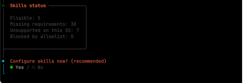 选择你 OpenClaw 的技能和一些配置,选择 Yes