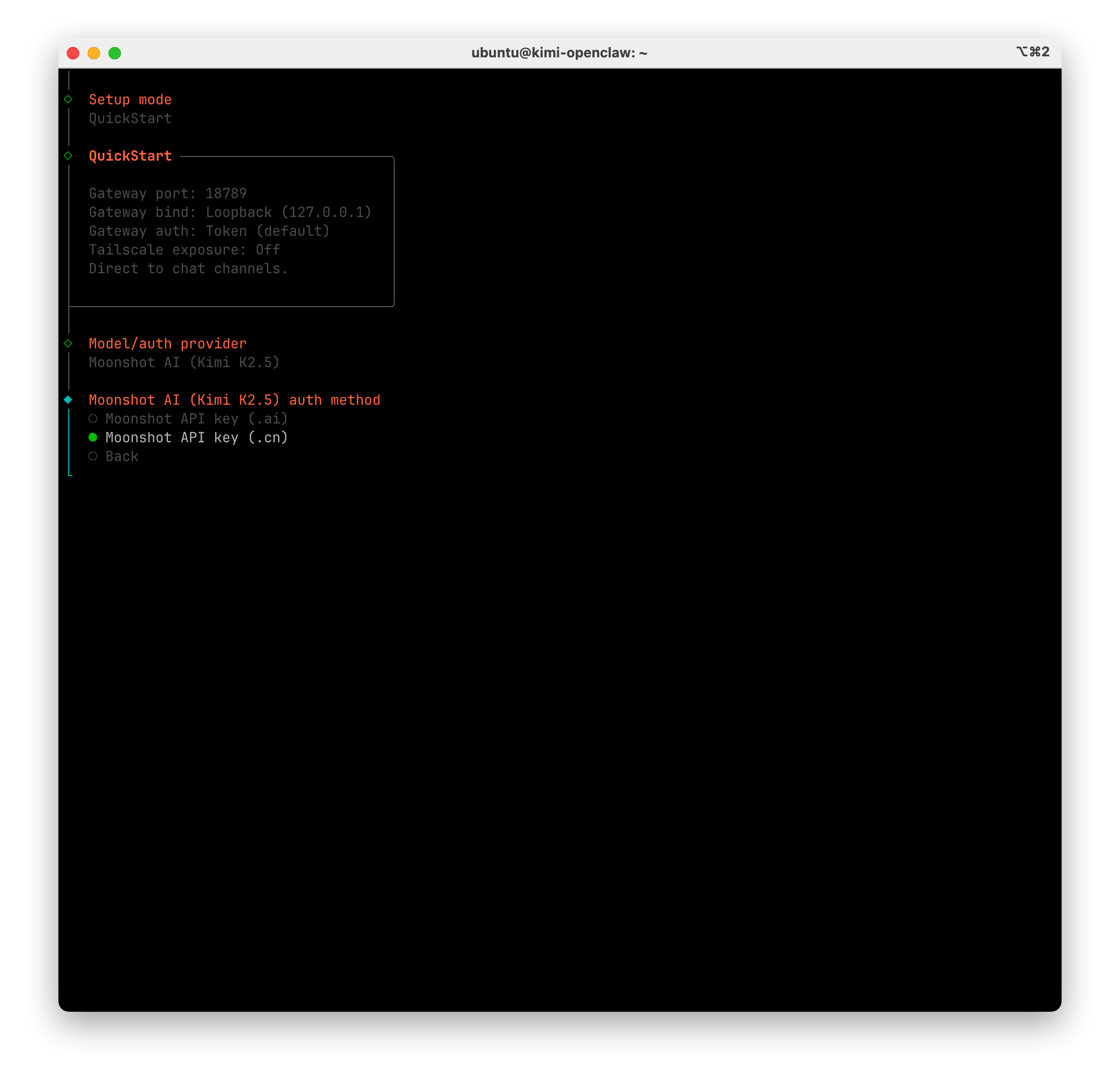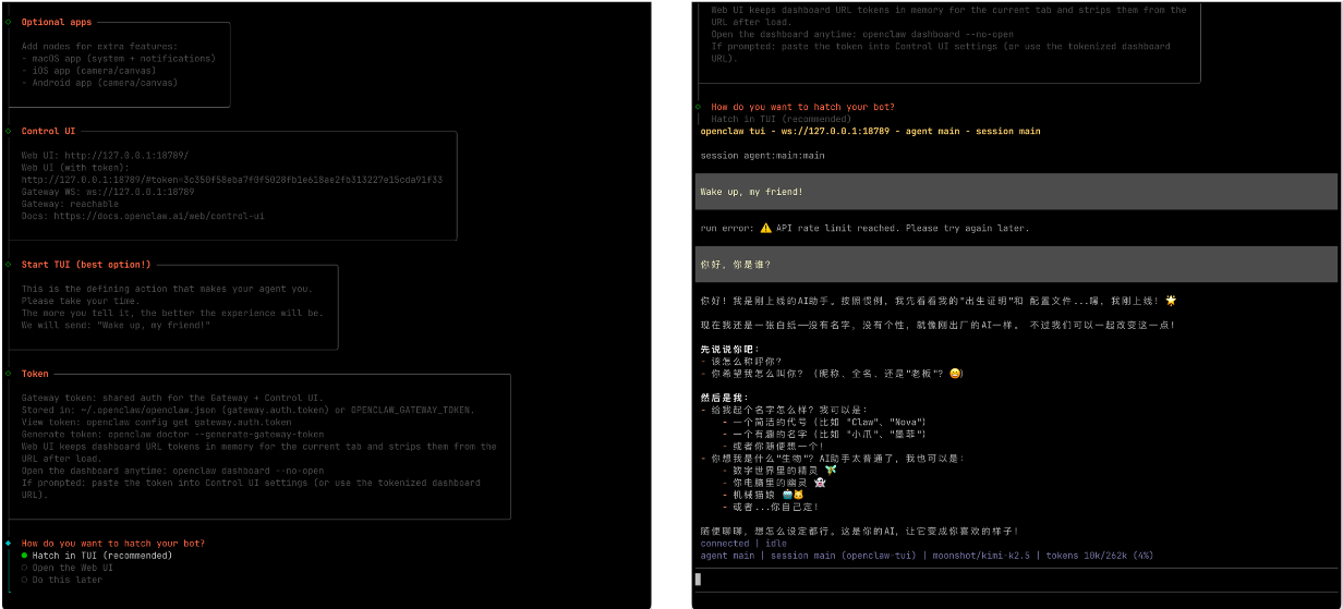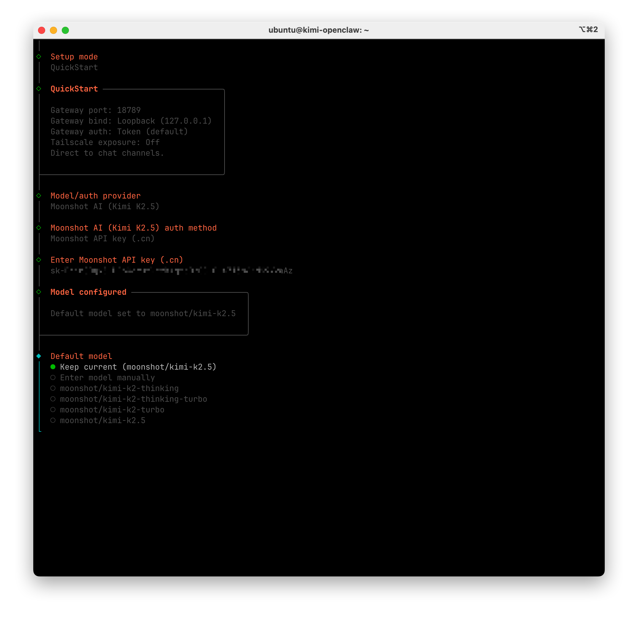 将复制的 API Key 贴入终端并敲击回车,然后选择 Moonshot/Kimi-K2.5 模型并敲击回车确认。