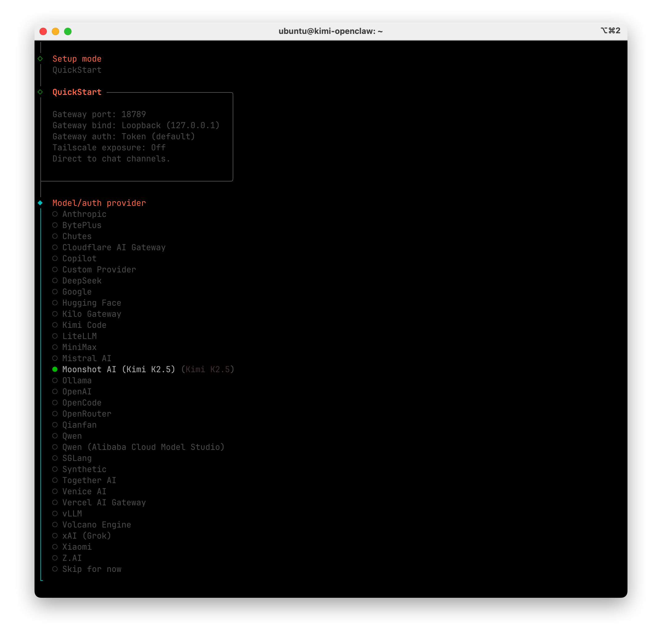 选择 Model,这里我们按需选择 OpenClaw 创始人推荐的 Moonshot AI(Kimi K2.5)/ Open AI/ Anthropic 作为基础模型。(本次选择的是 Kimi K2.5 进行演示)