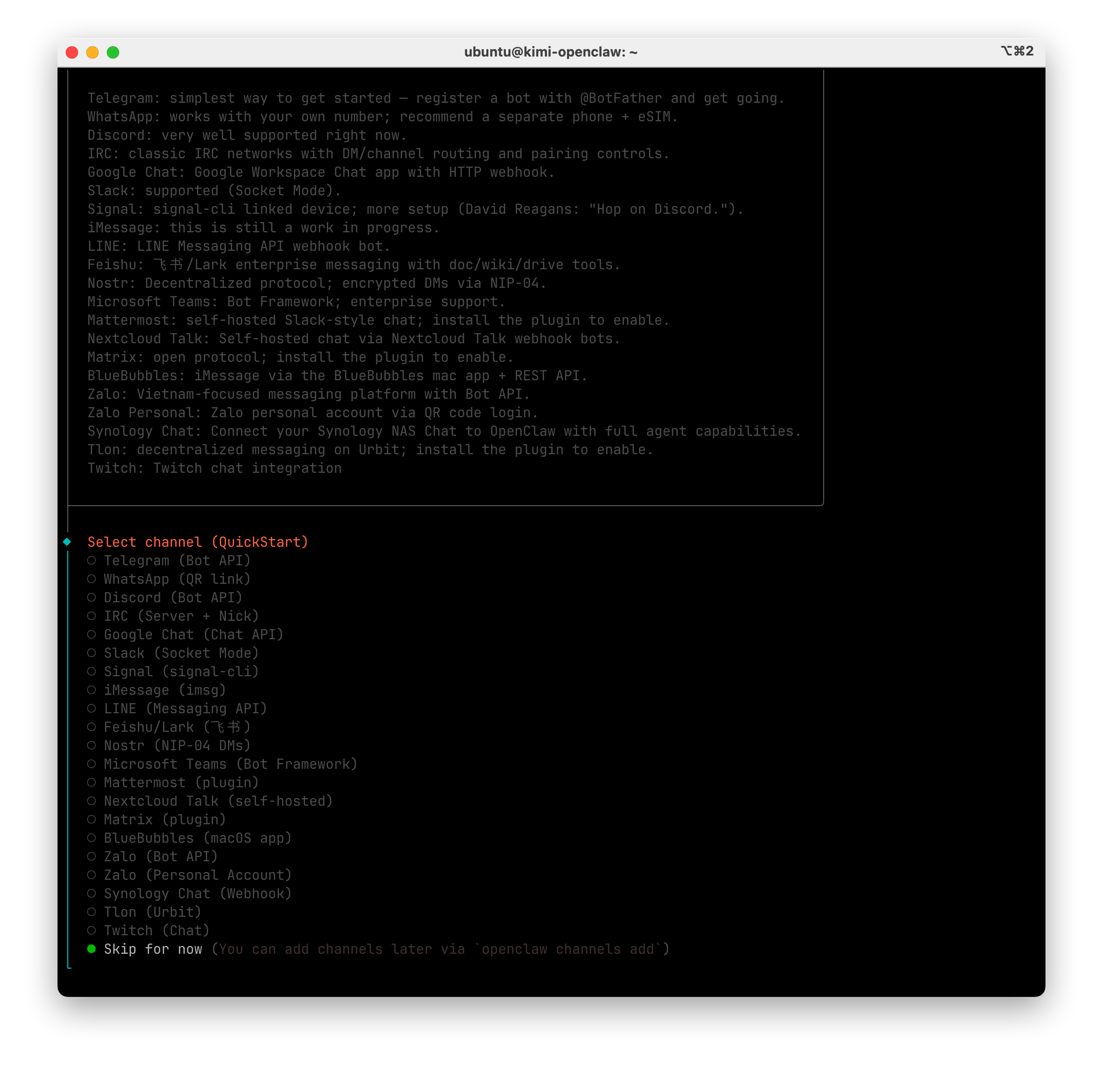 选择与 OpenClaw 聊天的载体,我们可以先跳过,使用 tui 进行体验。