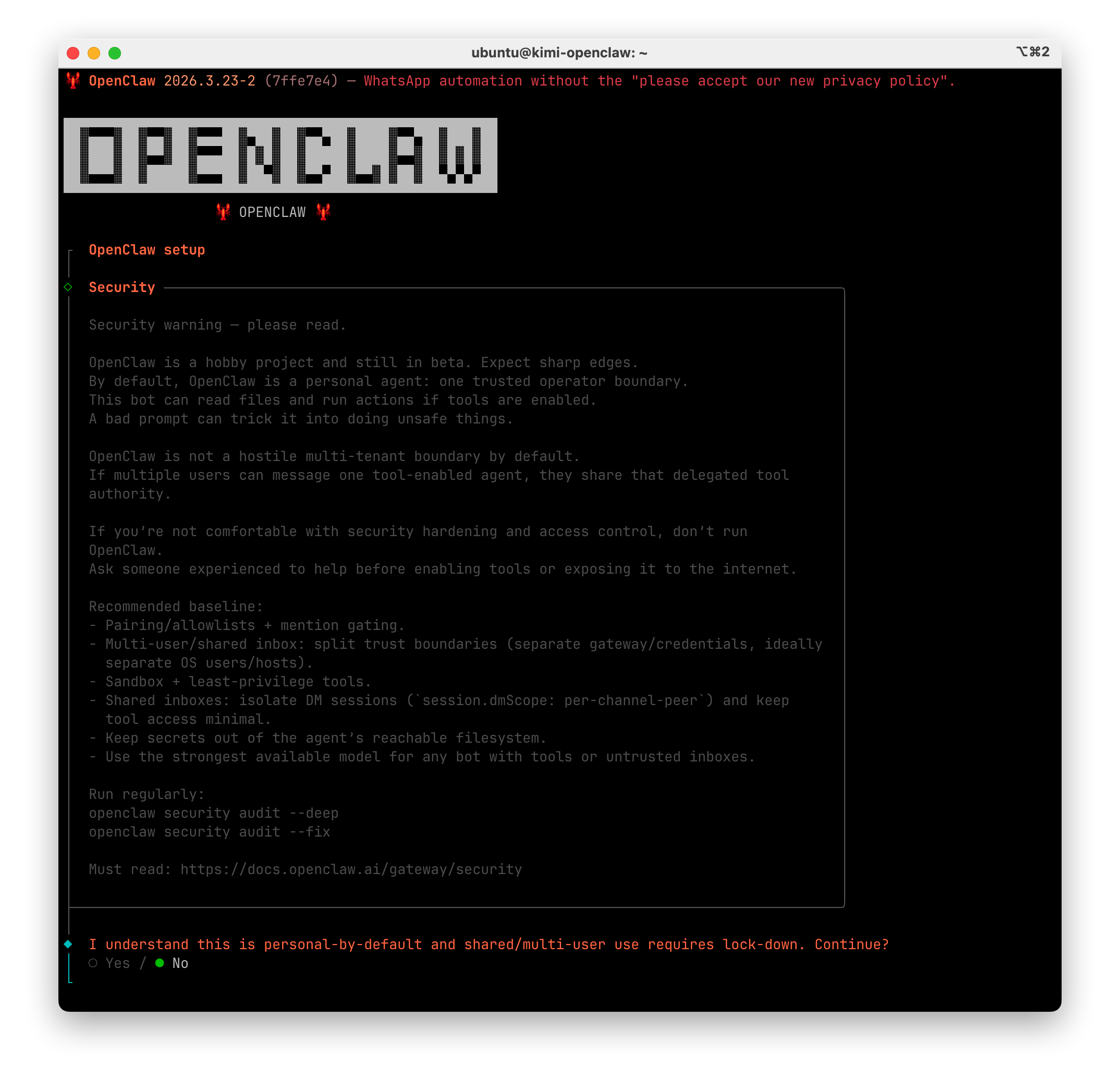 第一步安装成功后显示下面画面,我们选择 Yes 并回车,表示知道风险。可以用键盘方向键左右切换 Yes 或 No