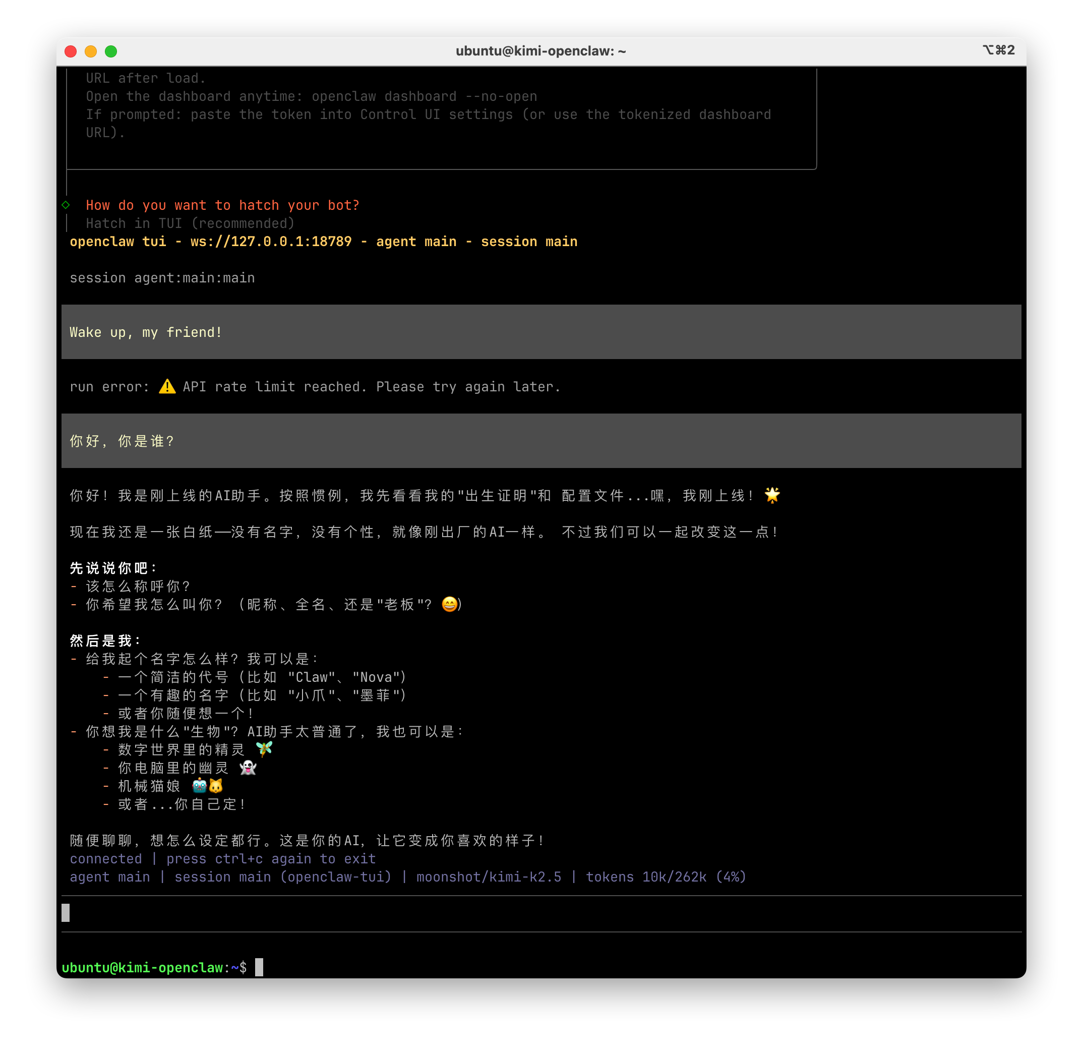 输入 openclaw tui 可返回 tui 继续聊天