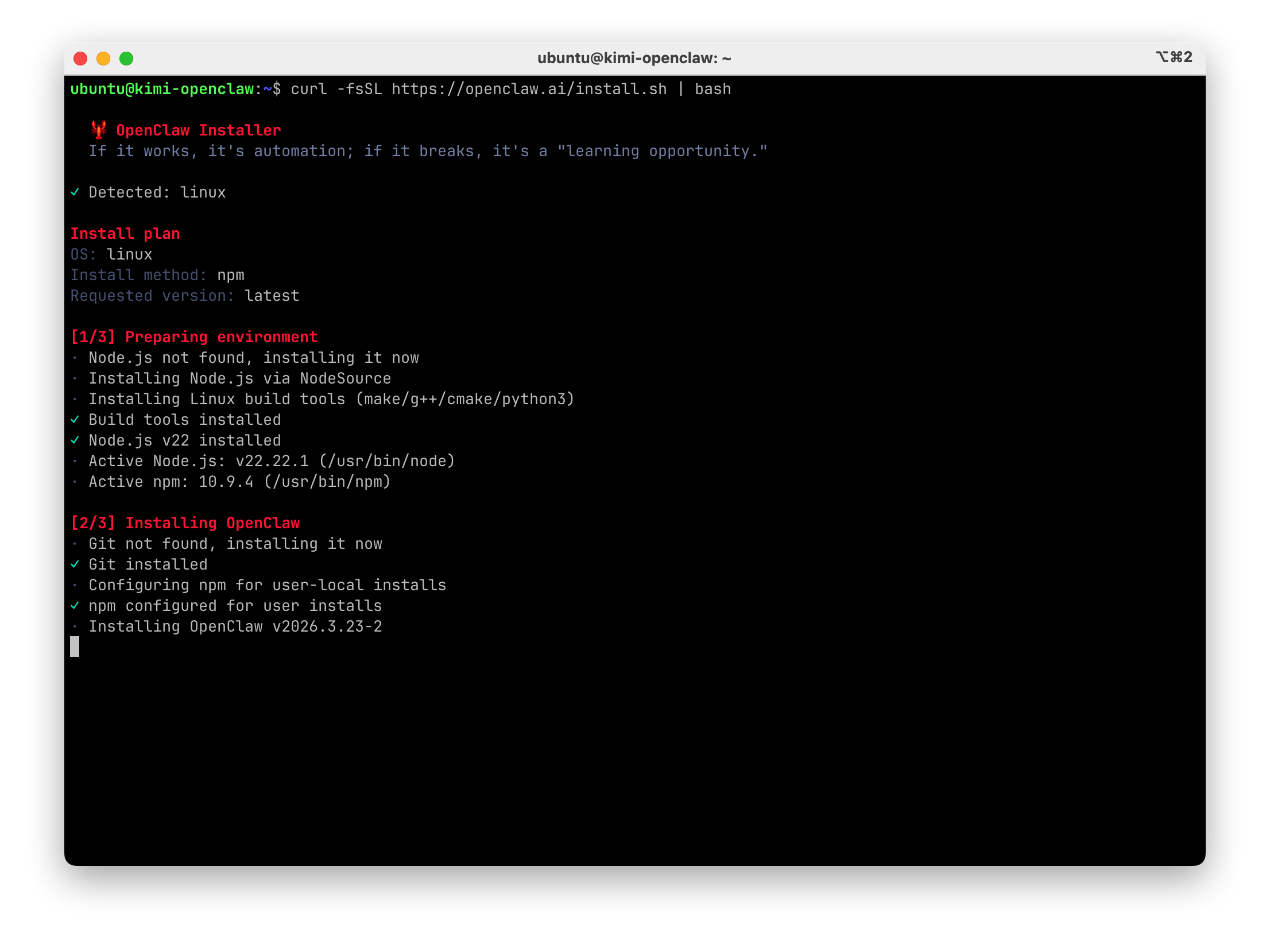 需要打开电脑终端软件,输入下面命令等待依赖和 openclaw 安装,主要依赖为 Node JS