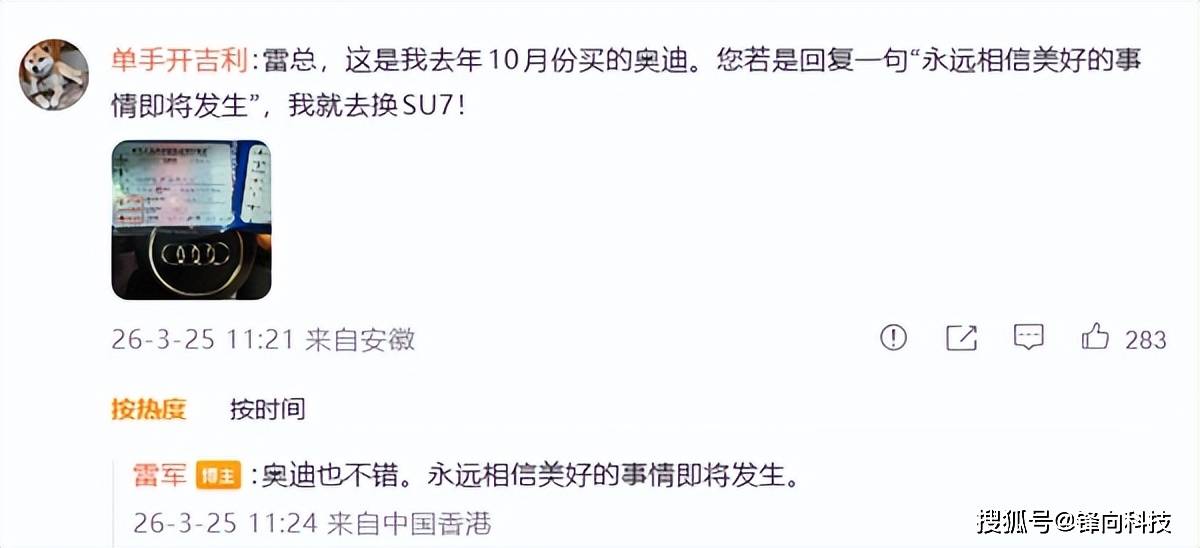 事情的起因源于一位奥迪车主在社交平台发布的一条动态。该车主表示,若雷军回复“永远相信美好的事情即将发生”,自己便会将座驾换成小米新一代SU7。令人意外的是,雷军在不到三分钟的时间内便回应道:“奥迪也不错,永远相信美好的事情即将发生。”这位车主也信守承诺,迅速下单购买了一台红色版本的小米新一代SU7,并晒出了订单,还透露不久后将分享提车过程。