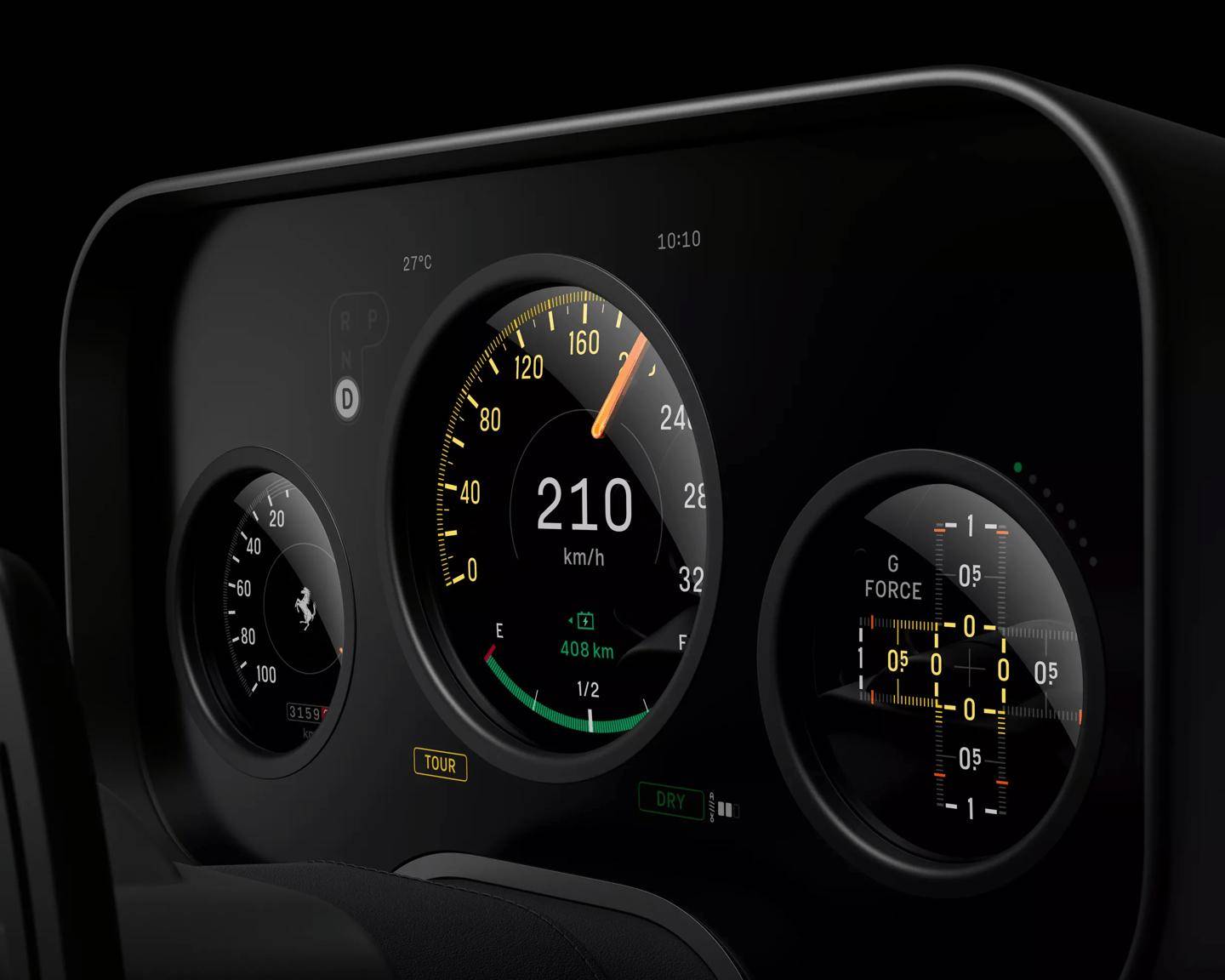 这种设计哲学在方向盘上体现得尤为彻底。这个延续法拉利经典三辐造型的部件,由19个精密加工零件组装而成,集成了驾驶模式切换、雨刷控制、转向灯操作等核心功能。与之配合的是三星定制的圆形OLED数字仪表,其曲面玻璃表面经过特殊防眩处理,确保在各种光照条件下都能清晰显示关键信息。艾维团队特别强调,仪表盘与方向盘的布局经过人体工程学优化,使驾驶员视线移动范围控制在最小幅度。