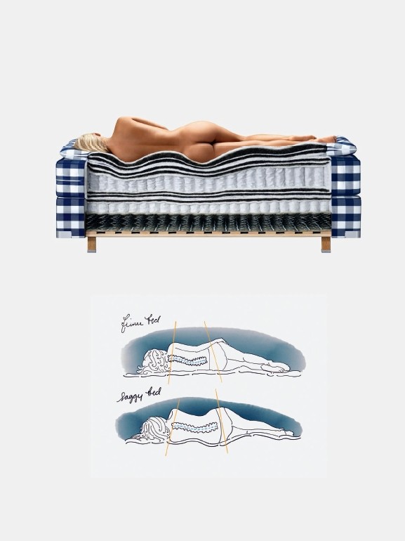 反过来床垫太软也不行,整个人陷进去,腰椎会被带着弯曲变形,椎间盘压力反而更大。