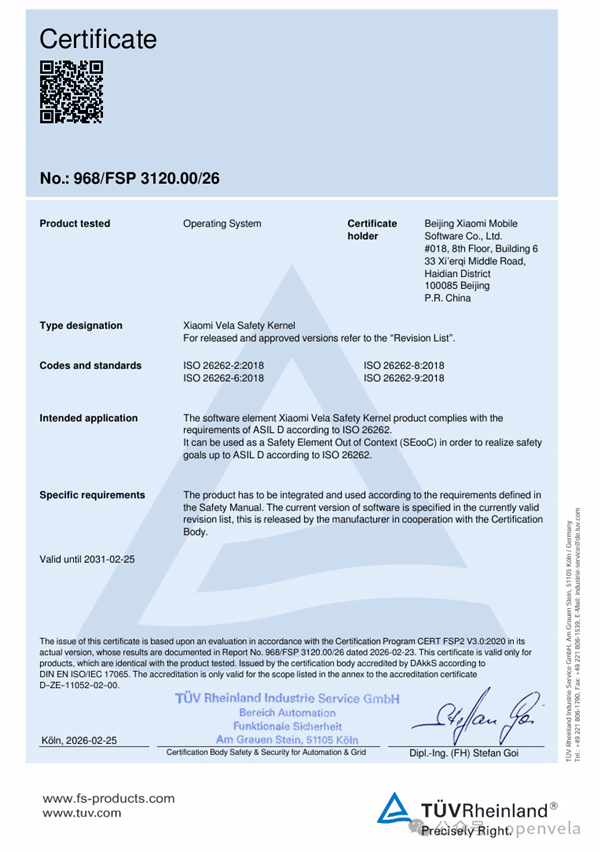 全球汽车功能安全领域迎来重要突破——小米自主研发的Xiaomi Vela Safety内核近日通过德国莱茵TÜV认证,获得ISO 26262 ASIL-D最高等级功能安全认证。这一认证标志着小米在车规级操作系统内核研发上实现关键跨越,为智能电动汽车核心安全系统的规模化应用奠定技术基石。