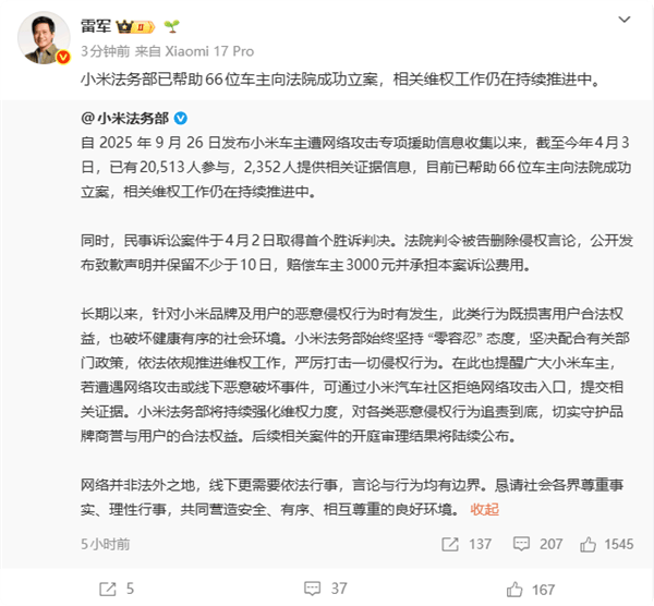 小米法务部近日对外披露,针对部分车主遭遇的网络恶意攻击事件,已成功协助66位车主完成法律立案程序,相关维权行动仍在深入推进。截至目前,民事诉讼领域已取得突破性进展——4月2日,首例案件迎来胜诉判决,被告被法院责令删除侵权内容、公开致歉并保留道歉声明不少于10日,同时需向车主赔偿3000元及承担诉讼费用。