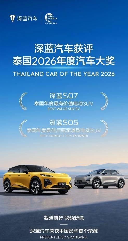 在海外市场,深蓝汽车也取得了显著成绩。目前,深蓝已覆盖全球约100个国家和地区,包括东南亚、欧洲、中东、非洲、中南美洲等。S05和S07双双获得泰国2026年度汽车大奖,这是中国汽车品牌首次在该奖项上取得突破。深蓝还在加速海外布局,G318在欧亚区域上市,S05在丹麦发布、亮相曼谷国际车展等,进一步提升了品牌的国际影响力。