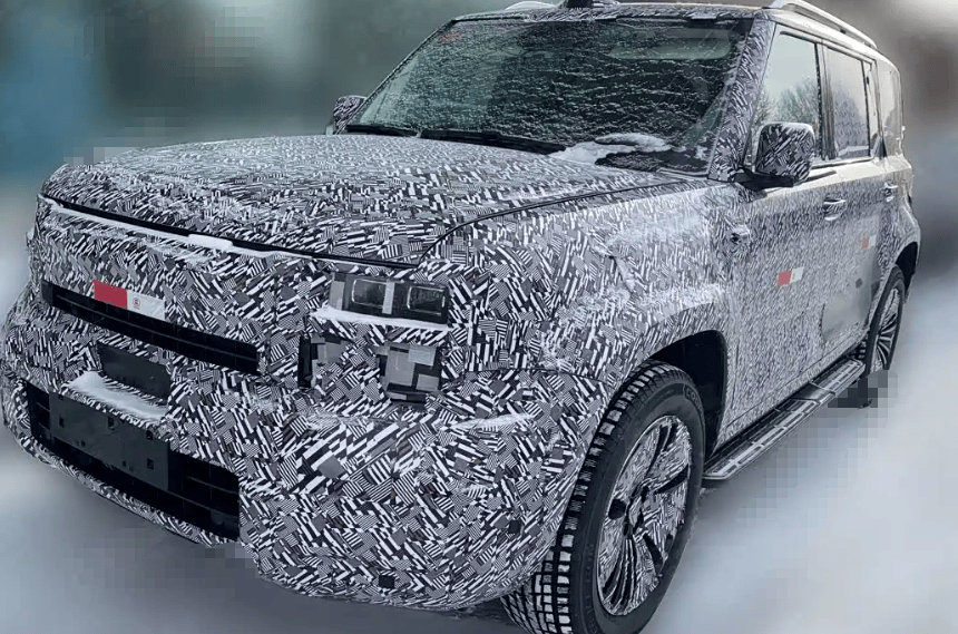 从谍照中可以看到,新车采用了当下流行的方盒子硬派造型,车身整体显得魁梧大气。车头部分,矩形大灯与半封闭式格栅相搭配,下包围设计厚实,给人一种稳重可靠的感觉。车顶搭载了激光雷达,车身侧翼子板也布置有摄像头,这表明新车将配备高阶驾驶辅助系统,为驾驶者提供更安全、便捷的驾驶体验。车身侧面配备了固定式脚踏板,方便乘客上下车;尾部保留了外挂式备胎接口,搭配侧开式尾门,硬派越野风格十分浓郁。在车身尺寸方面,新车车长预计超过5米,车宽接近2米,车内采用2 + 2 + 2的六座布局,空间表现相当宽裕,能够满足家庭出行或多人乘坐的需求。