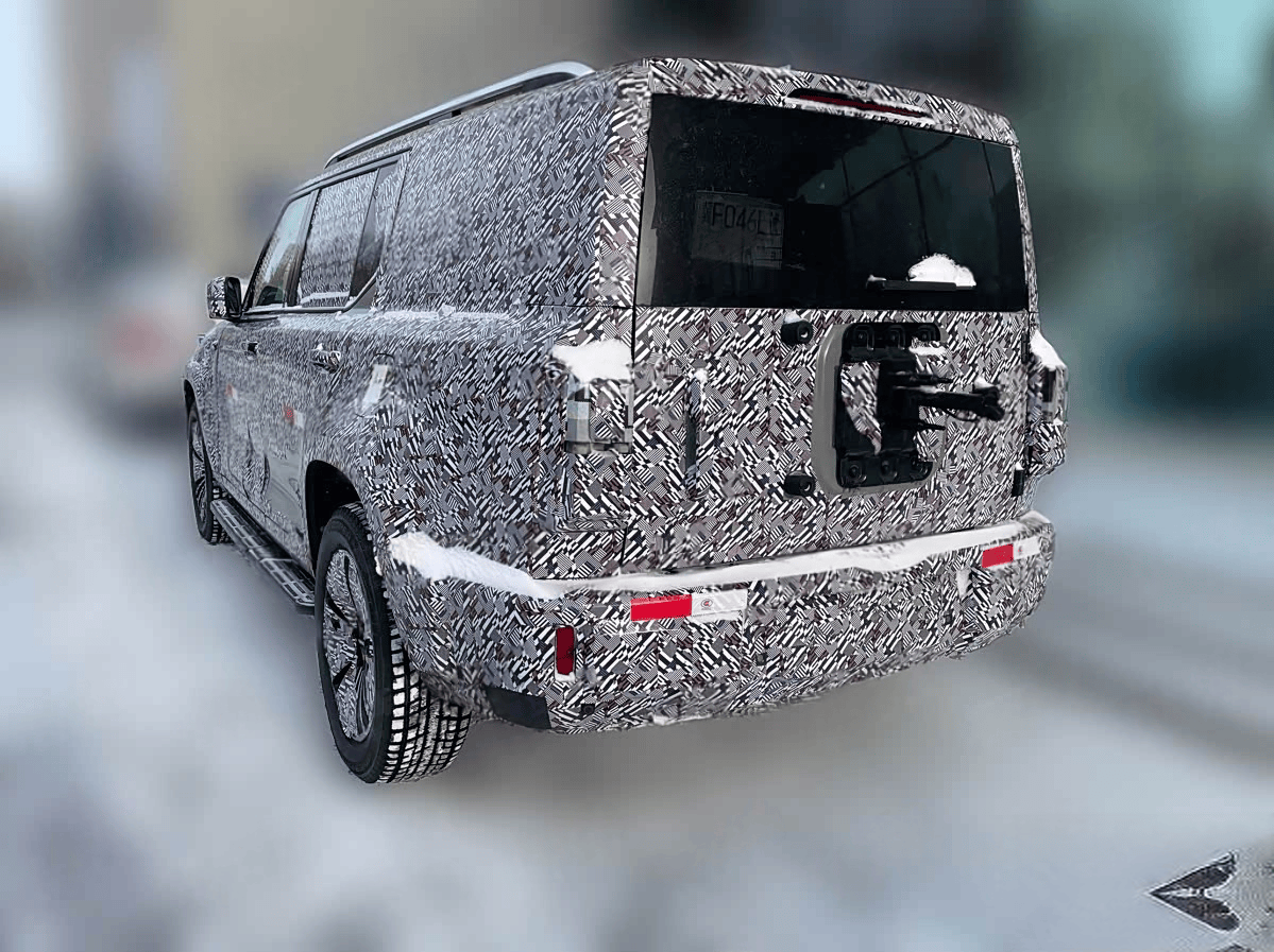 来到车尾,尾门中间预留了外挂备胎接口,结合尾门把手的样式推测,新车大概率会配备侧开式尾门,这种设计在硬派SUV中较为常见,方便取放物品。