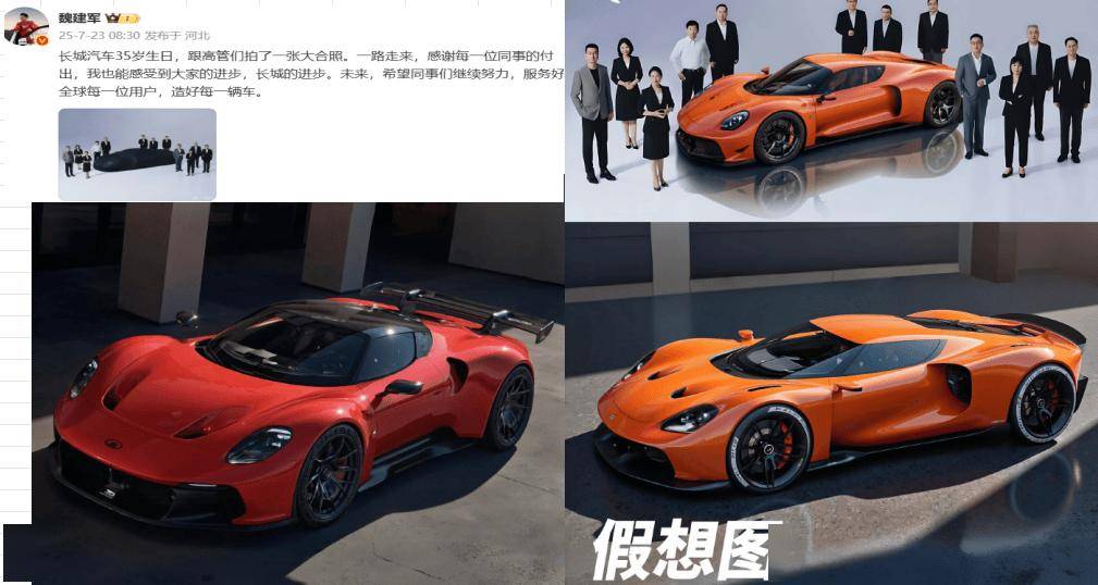 长城汽车的高性能布局早有端倪。2025年7月23日,魏建军曾在长城汽车35周年庆典上发布一张高管合影,照片中央一辆低趴跑车引发猜测。从设计细节看,该车采用低趴车身、大尺寸腰部进气口及上翘尾翼,整体轮廓与法拉利SF90等顶级超跑颇具相似之处。据市场传言,这款对标法拉利SF90的车型将搭载4.0T V8双涡轮发动机与电机组成的混动系统,最大马力预计达549Ps,售价或突破百万元级别。不过从此次直播透露的信息来看,其上市时间已推迟至2027年。