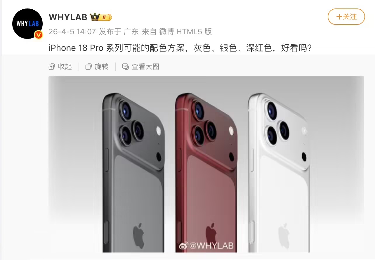 据科技领域消息人士WHYLAB最新爆料,苹果即将推出的iPhone 18 Pro系列或将带来三款全新配色选择,包括经典银色、低调灰色以及首次亮相的深红色。该消息源同步公开了由数码博主fpt制作的机型概念渲染图,展示了新配色的视觉效果。