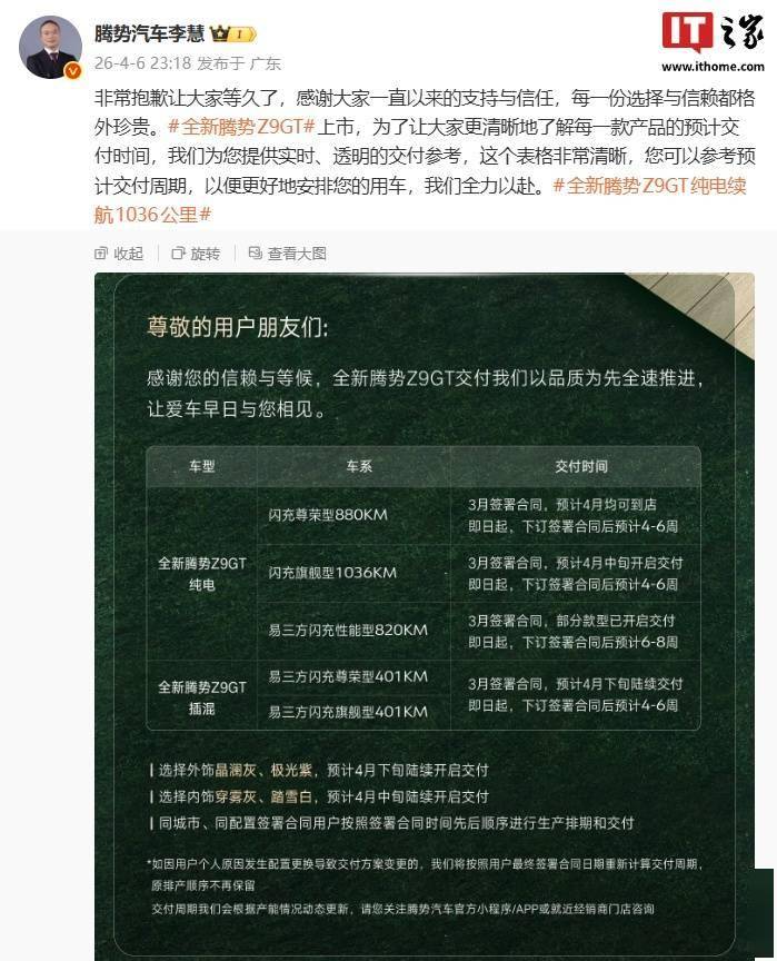 比亚迪腾势汽车总经理李慧近日对外公布了全新腾势Z9GT各车型的详细交付时间表,为消费者提供了清晰透明的购车参考。这一举措旨在让消费者更准确地掌握车辆交付进度,提升购车体验。