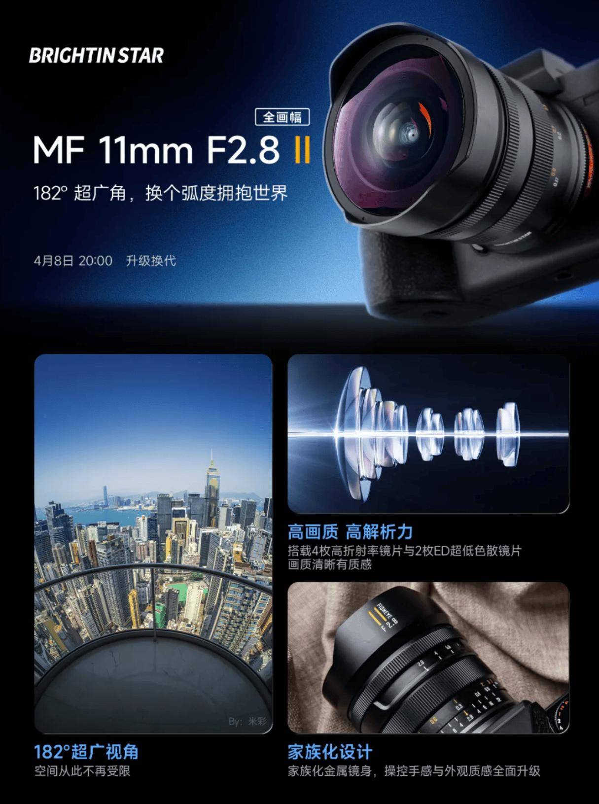 星曜即将推出一款专为全画幅相机设计的鱼眼镜头——星曜11mm f/2.8 II,其发布时间定于今晚20:00。这款镜头凭借其独特的182°超广角视角,成为城市风景与建筑摄影领域的理想选择。
