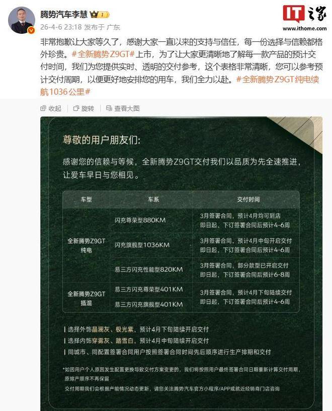 比亚迪腾势汽车总经理李慧近日向外界披露了全新腾势Z9GT的详细交付计划,为消费者提供了清晰的交付时间参考。这一举措旨在提升购车体验,确保消费者能够实时了解车辆交付进度。