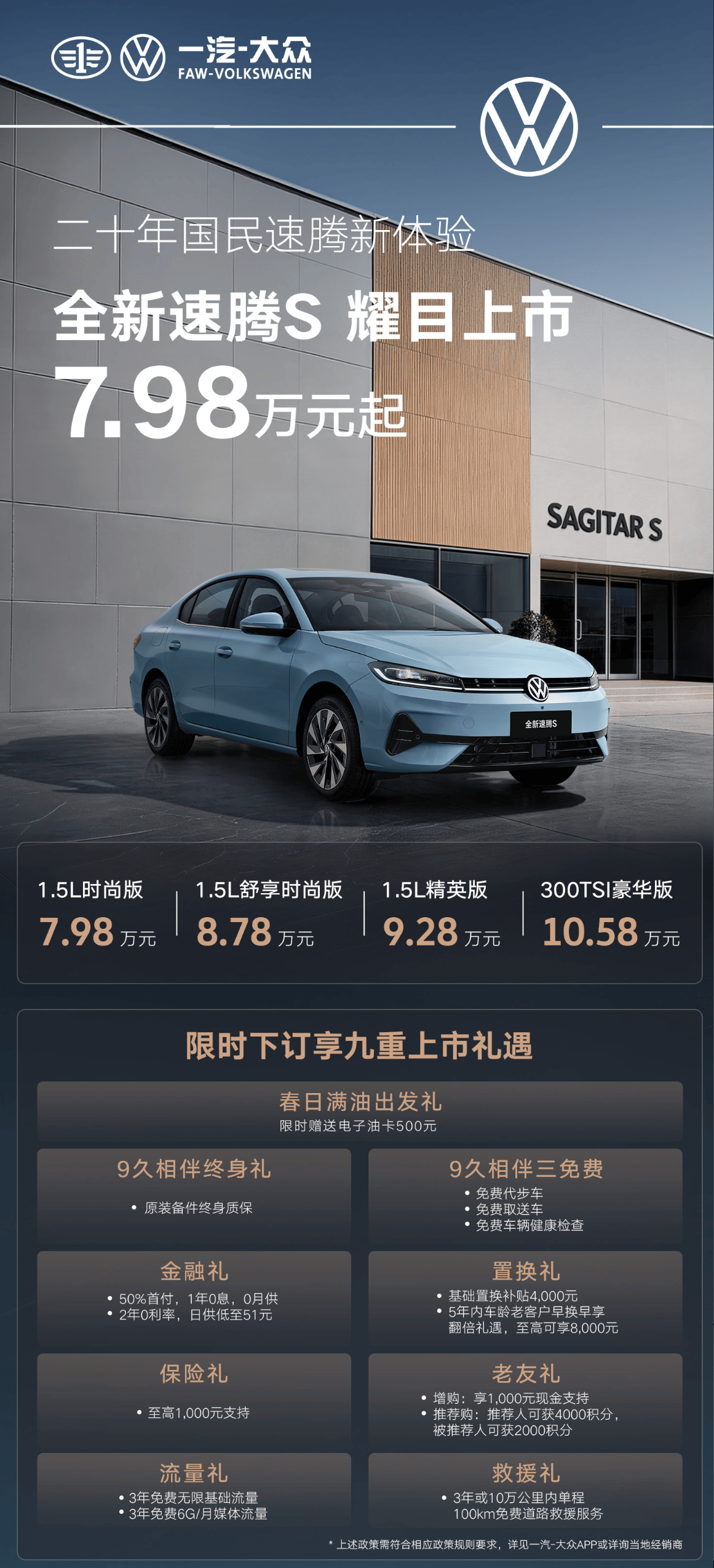 为进一步降低购车门槛,全新速腾S推出九重上市礼遇,包括终身质保、0息金融方案、满油出发礼等,将诚意渗透至购车全流程。在电动化浪潮席卷市场的背景下,这款燃油车型凭借扎实的技术底蕴与极致性价比,证明传统家轿依然具备强大的市场竞争力。其“高值低价”的理念不仅重塑了消费者对A+级轿车的期待,更有望推动细分市场向更高品质的方向发展。
