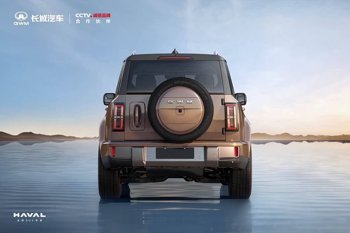 尾部设计完美诠释了越野车的经典元素,竖向排列的尾灯组采用复杂灯腔结构,点亮后效果极具辨识度。侧开式尾门搭配外挂式备胎设计,既实用又彰显硬派气质。根据官方透露的信息,尾灯组在夜间点亮时将呈现出独特的视觉效果,进一步强化整车的科技感与豪华感。