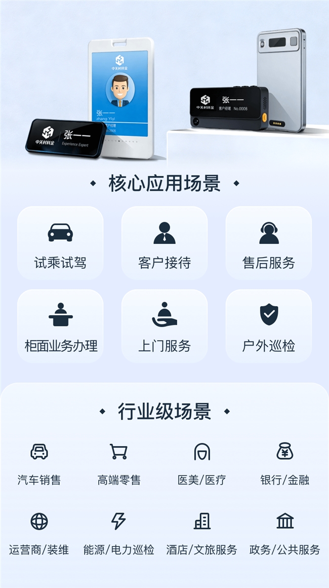 围绕企业最核心的线下场景,中关村科金构建了覆盖销售沟通、外勤作业、知识管理、可视管理四大场景的完整硬件能力。